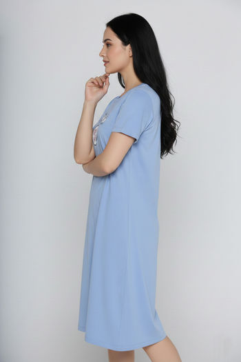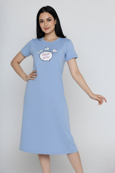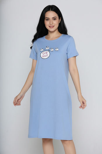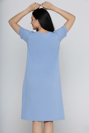 Zivame Farm Lore Knit Cotton Knee Length Night Dress - Chambray Blue