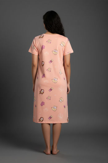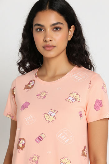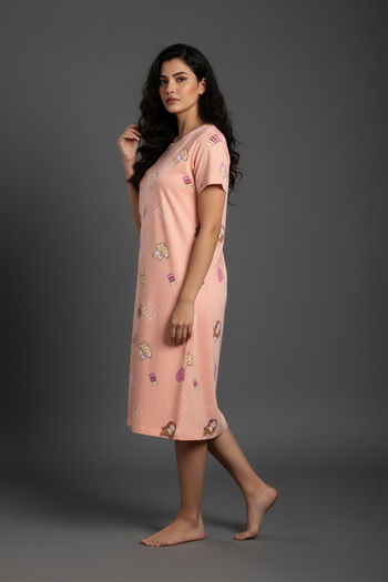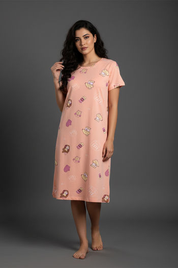 Zivame Farm Lore Knit Cotton Knee Length Nightdress - Peach Pearl