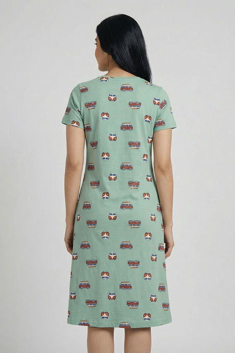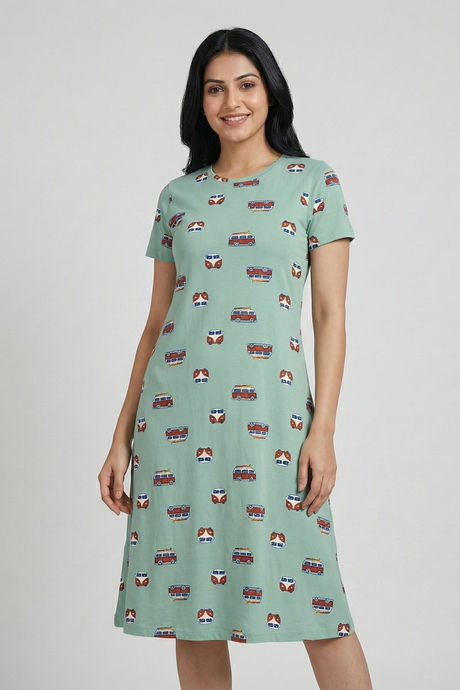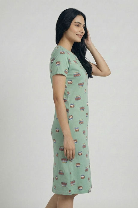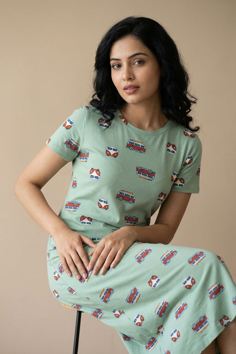 Zivame Farm Lore Knit Cotton Mid Length Nightdress - Cameo Green
