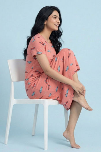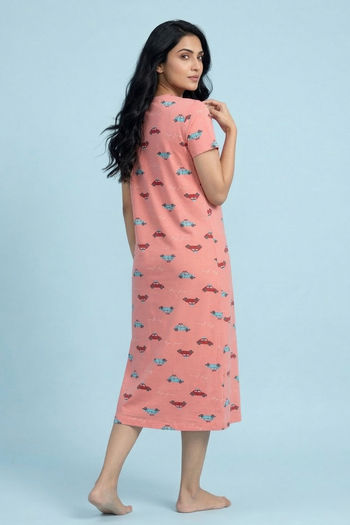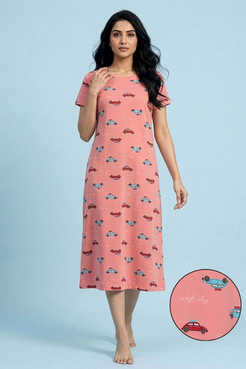 Zivame Farm Lore Knit Cotton Mid Length Nightdress - Peaches