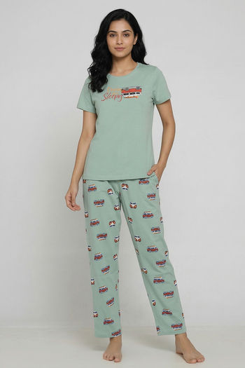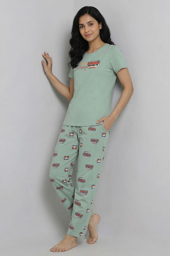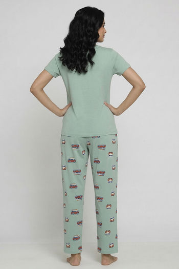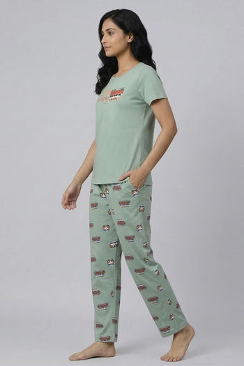 Zivame Farm Lore Knit Cotton Pyjama Set - Cameo Green