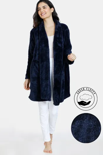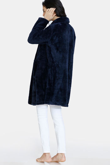 Zivame Fluffy Fur Knit Mid Thigh Length Hoodie Shrug - Black Iris
