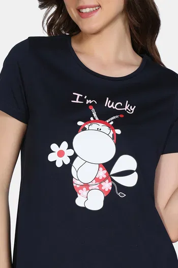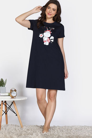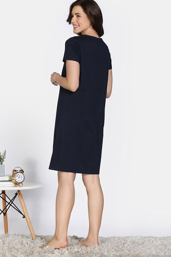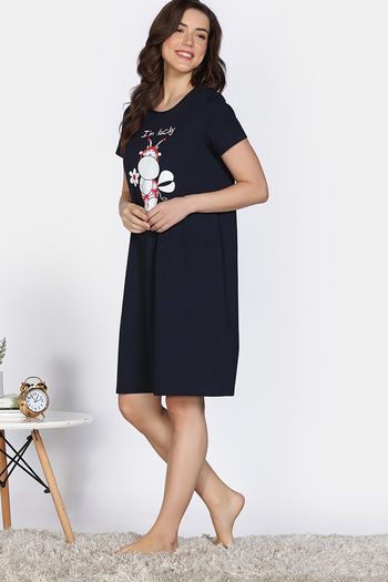 Zivame Farm Lore Knit Cotton Night Dress - Navy Peony