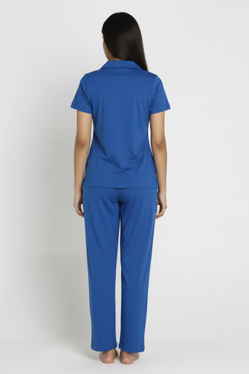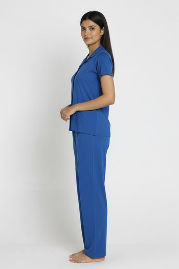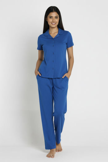 Zivame Knit Cotton Pyjama Set - Navy Peony