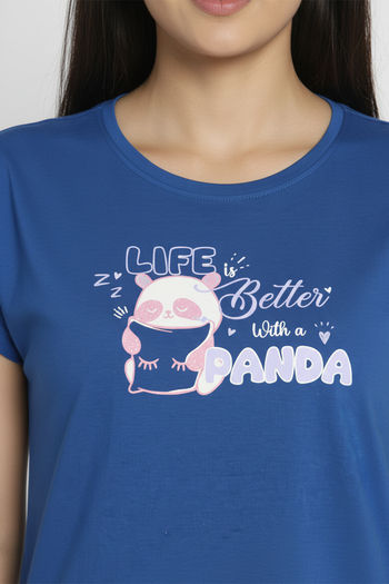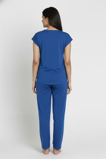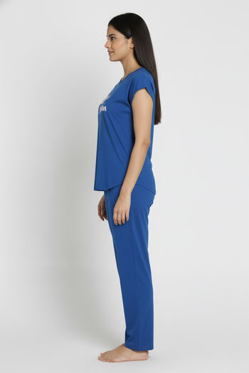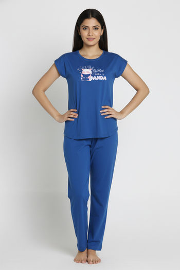 Zivame Knit Cotton Pyjama Set - Navy Peony