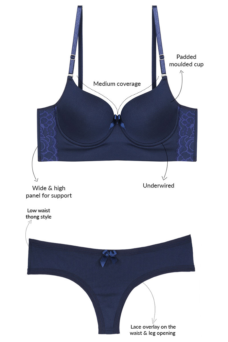 Zivame Medium Coverage Padded Bra with Thong Panty- Dark Blue