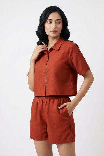 Zivame Mock Linen Woven Loungewear Set - Burnt Brick