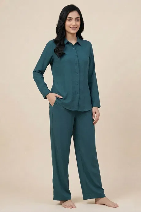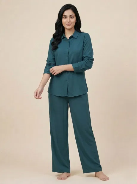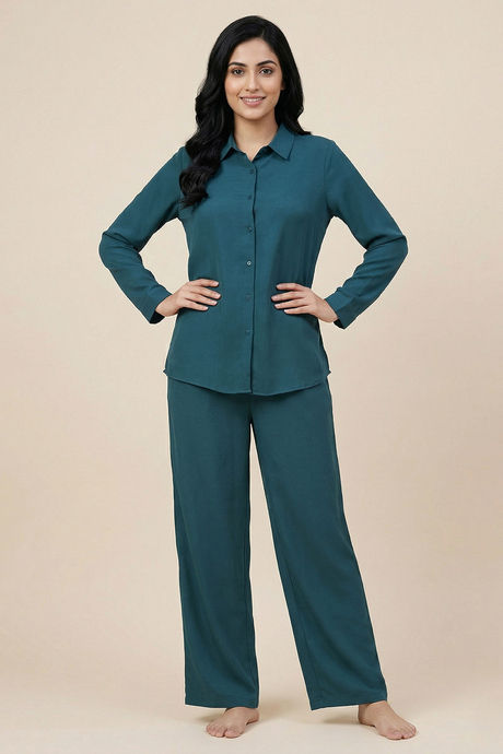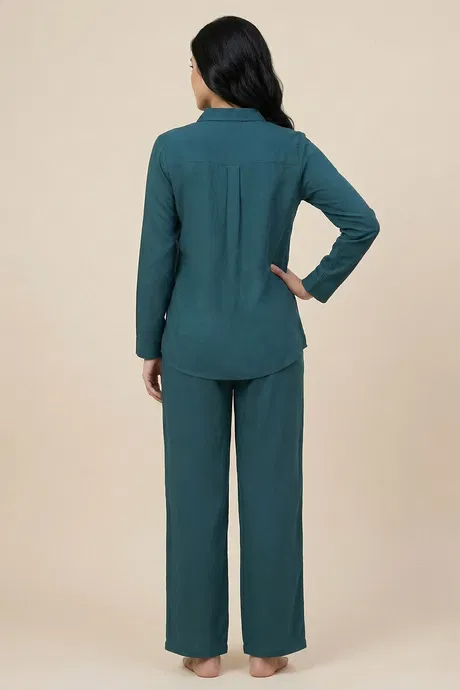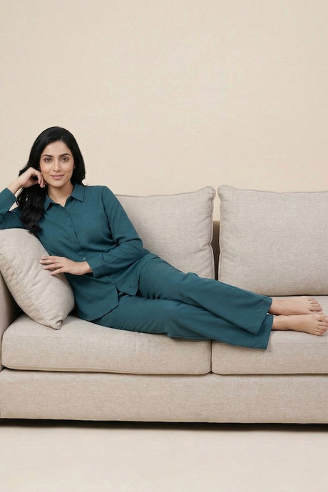 Zivame Mock Linen Woven Loungewear Set - Mediterranean