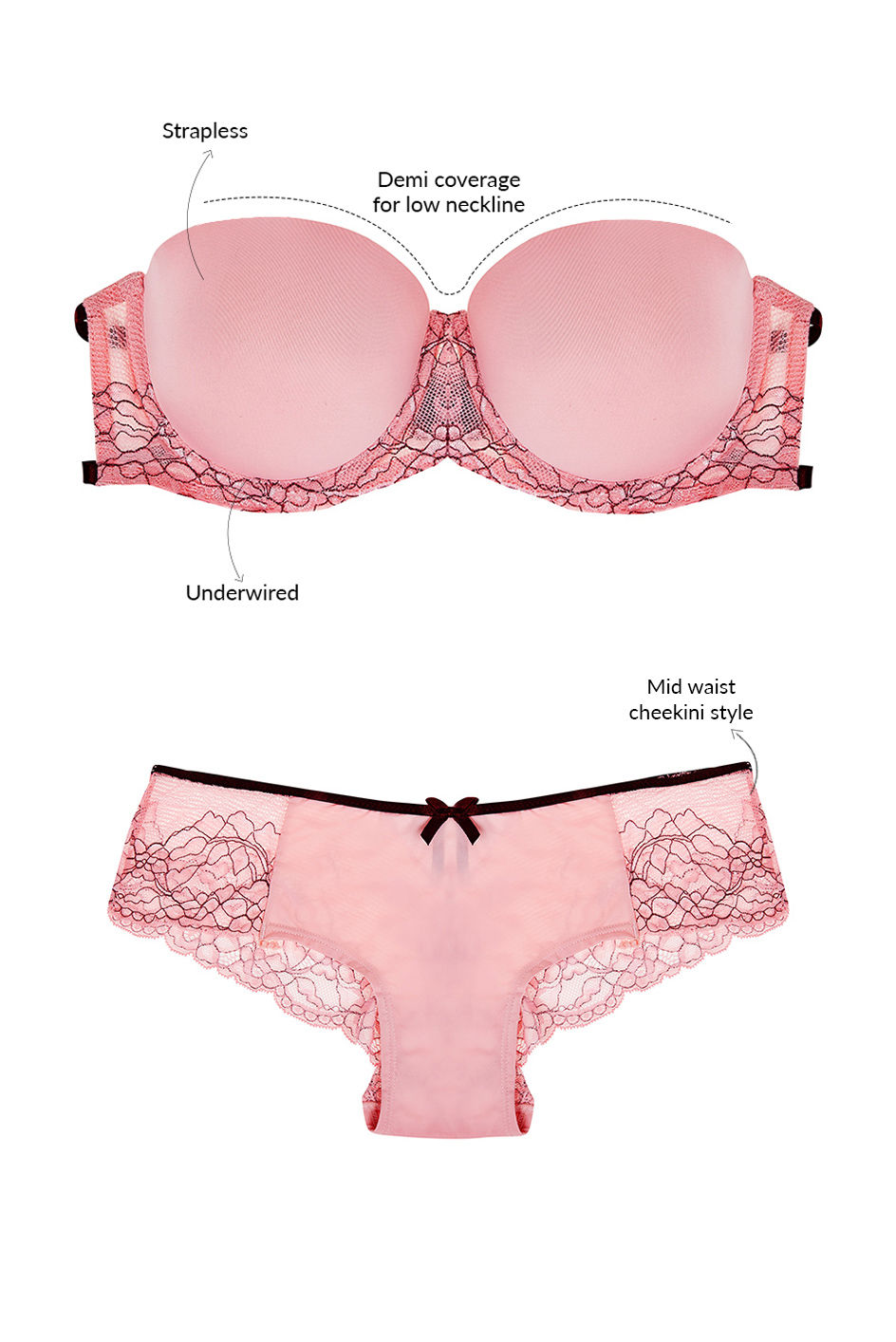 Zivame Moderate Pushup Strapless Bra With Mid Rise Cheeky Panty-Pink