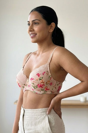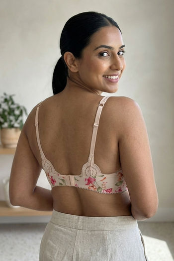 Zivame Floral Grace Padded Wired 3/4th Coverage Lace Bra - Light Pink Base With Flower