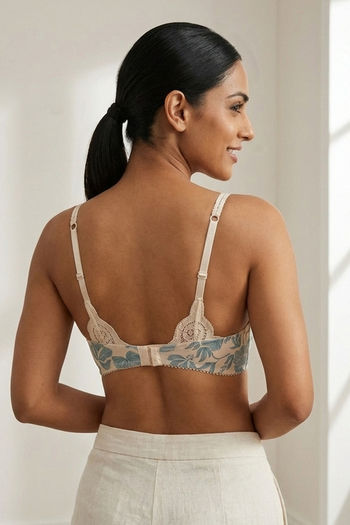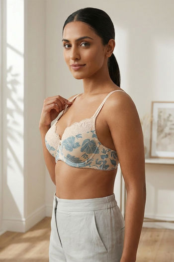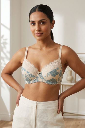Zivame Floral Grace Padded Wired 3/4th Coverage Lace Bra - White Base With Blue Flower