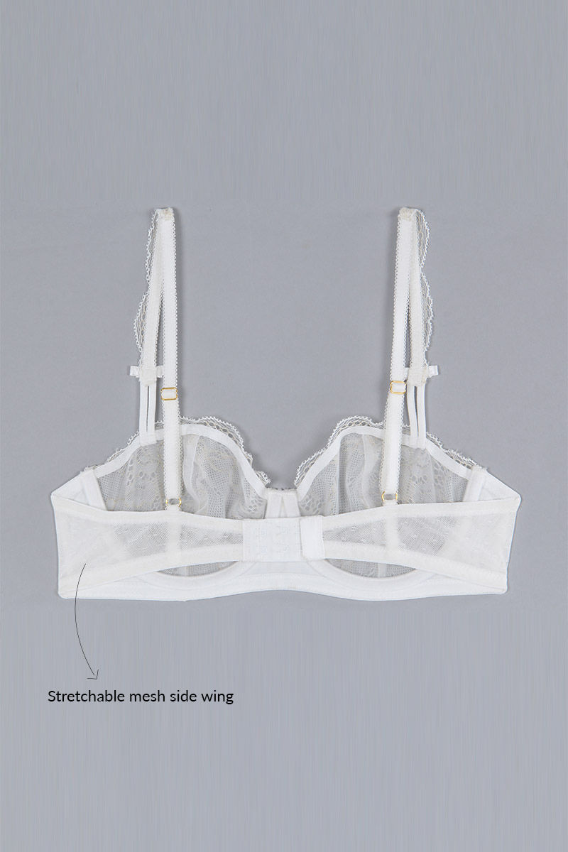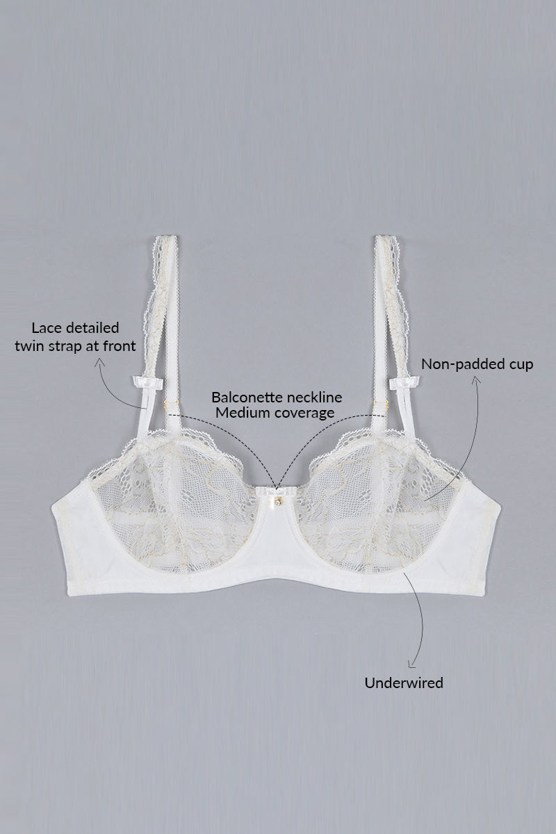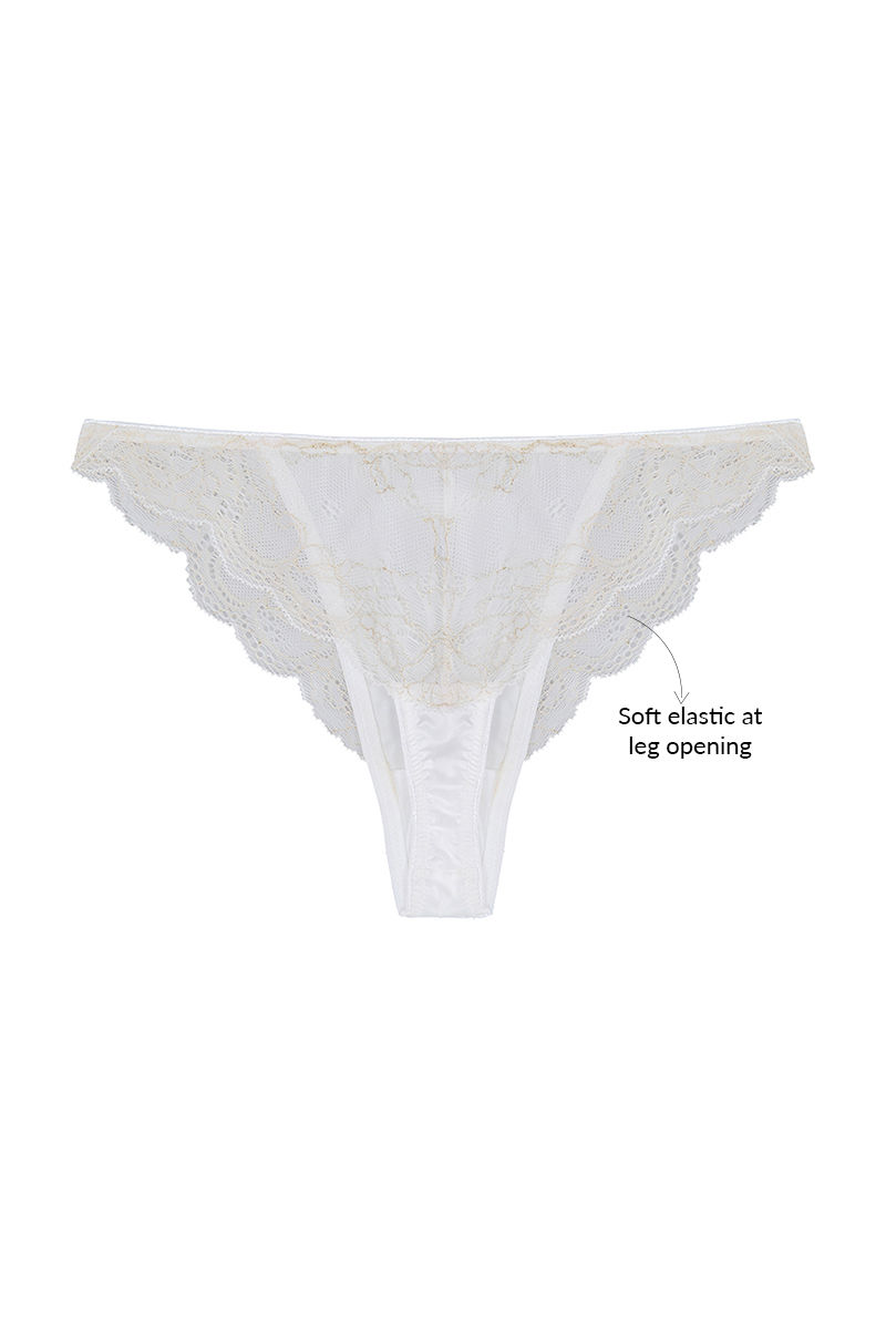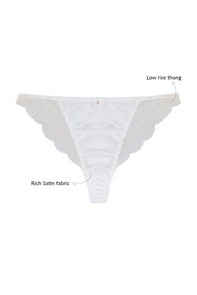 Zivame Satin Balconette Neckline Bra with Low Rise Thong Panty- Pearl White