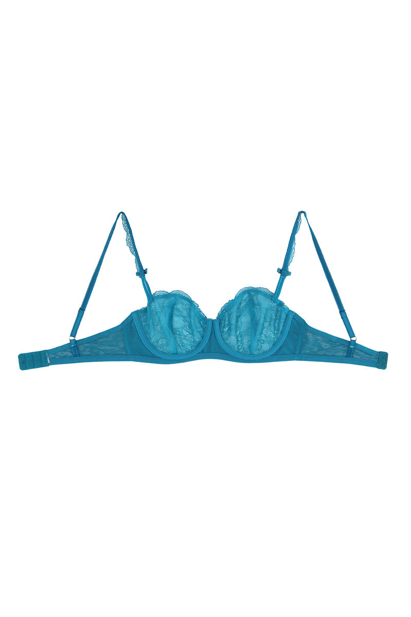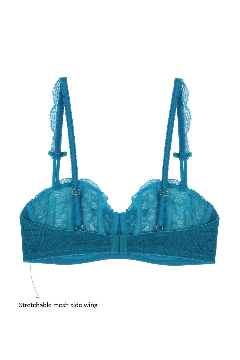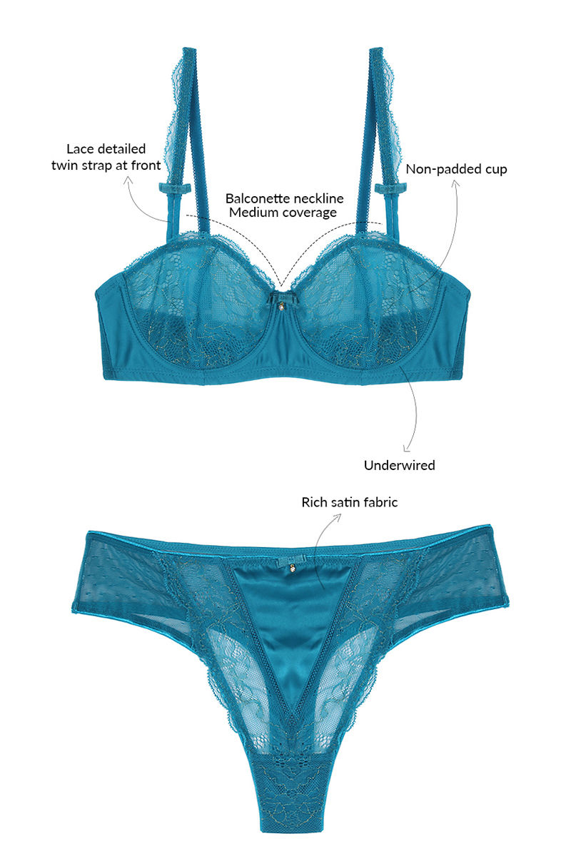 Zivame Satin Balconette Neckline Bra with Mid Rise Thong Panty- Mermaid Blue