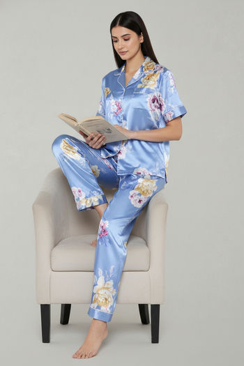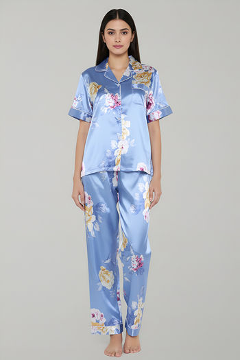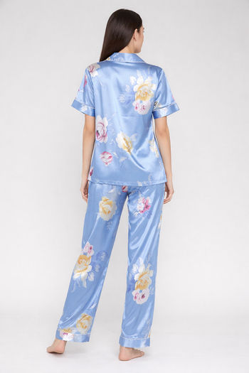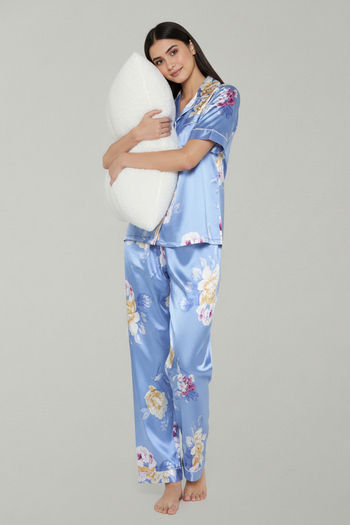 Zivame Satin Pyjama Set - Blue Floral