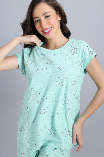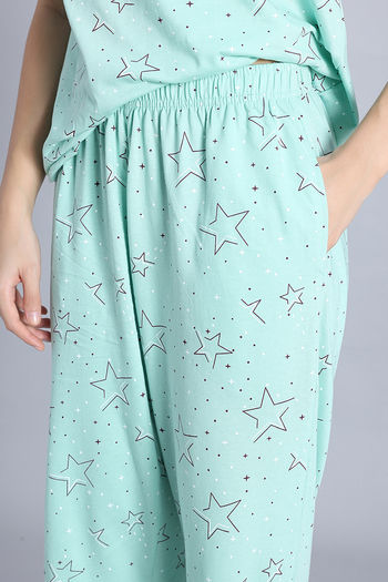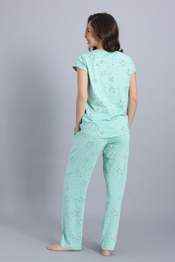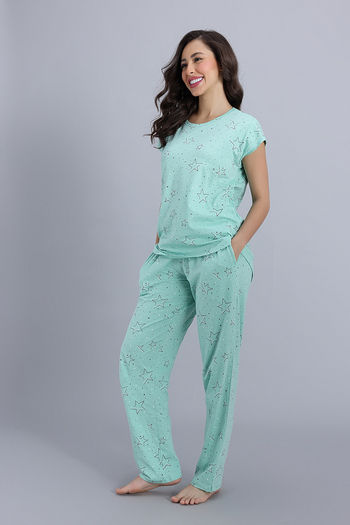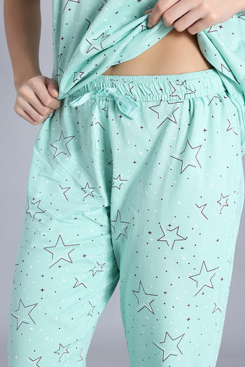 Zivame Starry Whisper Knit Cotton Pyjama Set - Mist Green